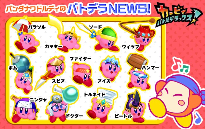 星のカービィ בטוויטר ばばーん 3dsソフト カービィ バトルデラックス 発表 これからはボク バンダナワドルディが最新情報をお届けするよ 今作はなんと最強のカービィを決める対戦アクション さっそく 登場するコピー能力をばばーんと大発表
